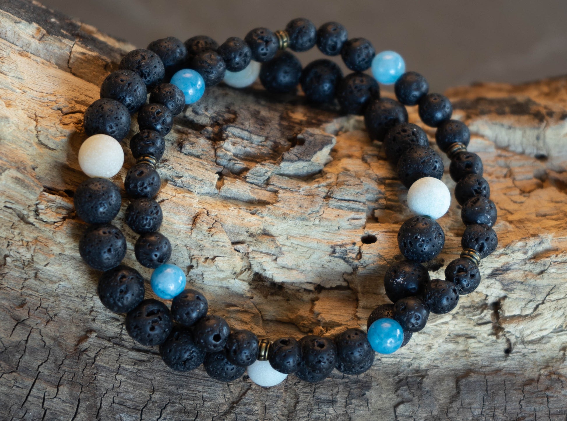 **Armband 1:** Dieses Armband besteht aus 6 mm großen Lavastein und Aquamarin. Die filigrane Größe verleiht dem Armband eine subtile Anmut und eignet sich hervorragend für den Alltag oder als dezentes Accessoire zu formellen Anlässen.